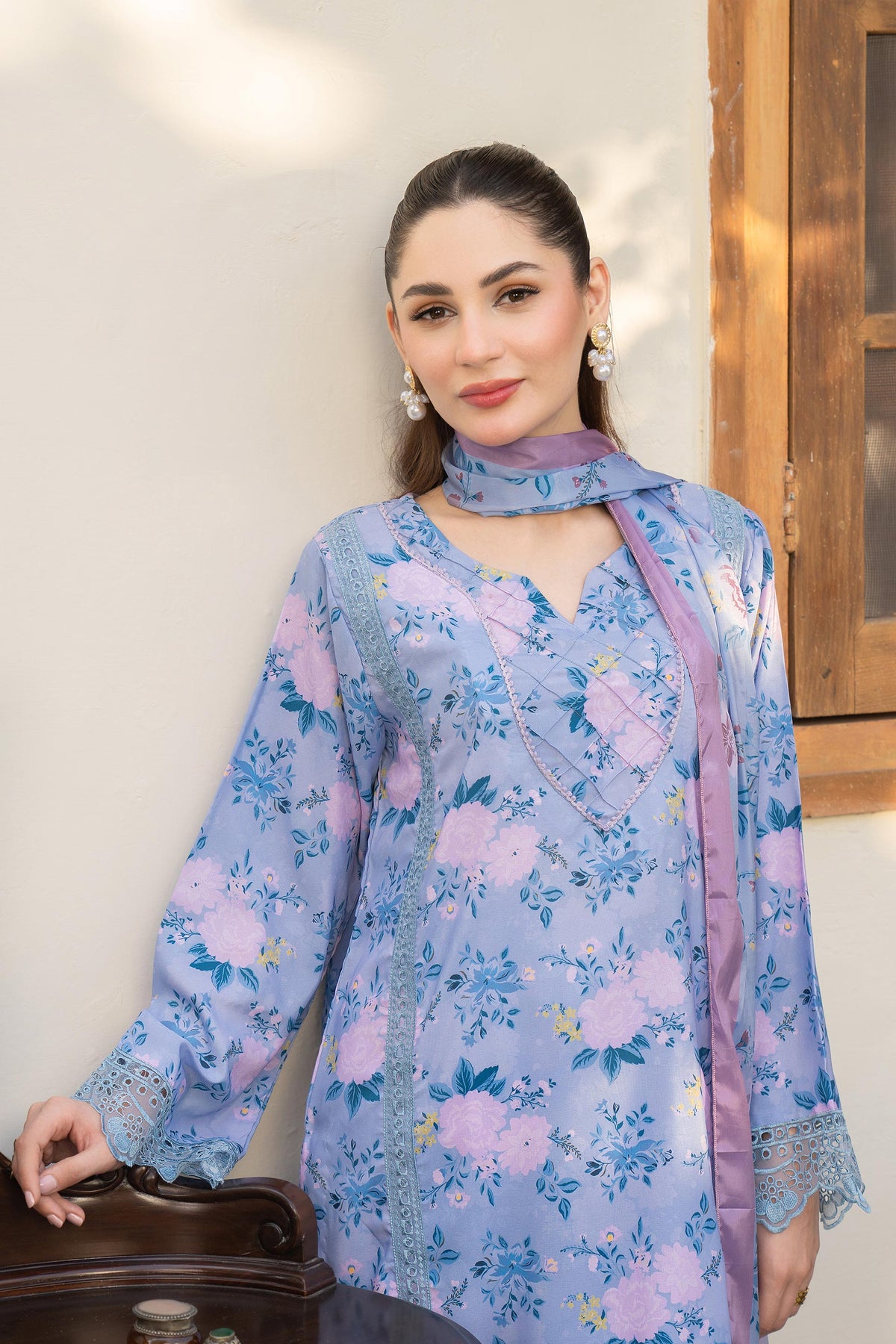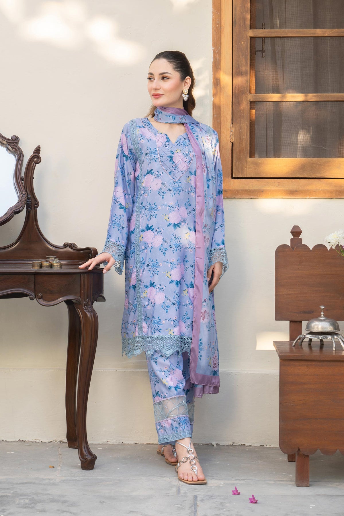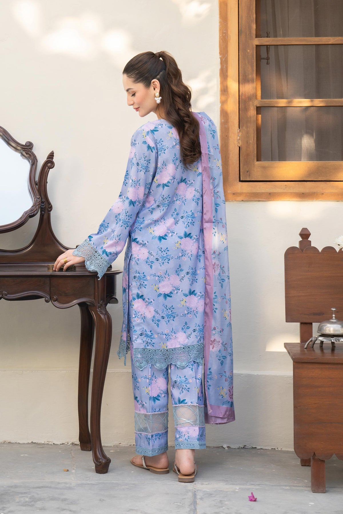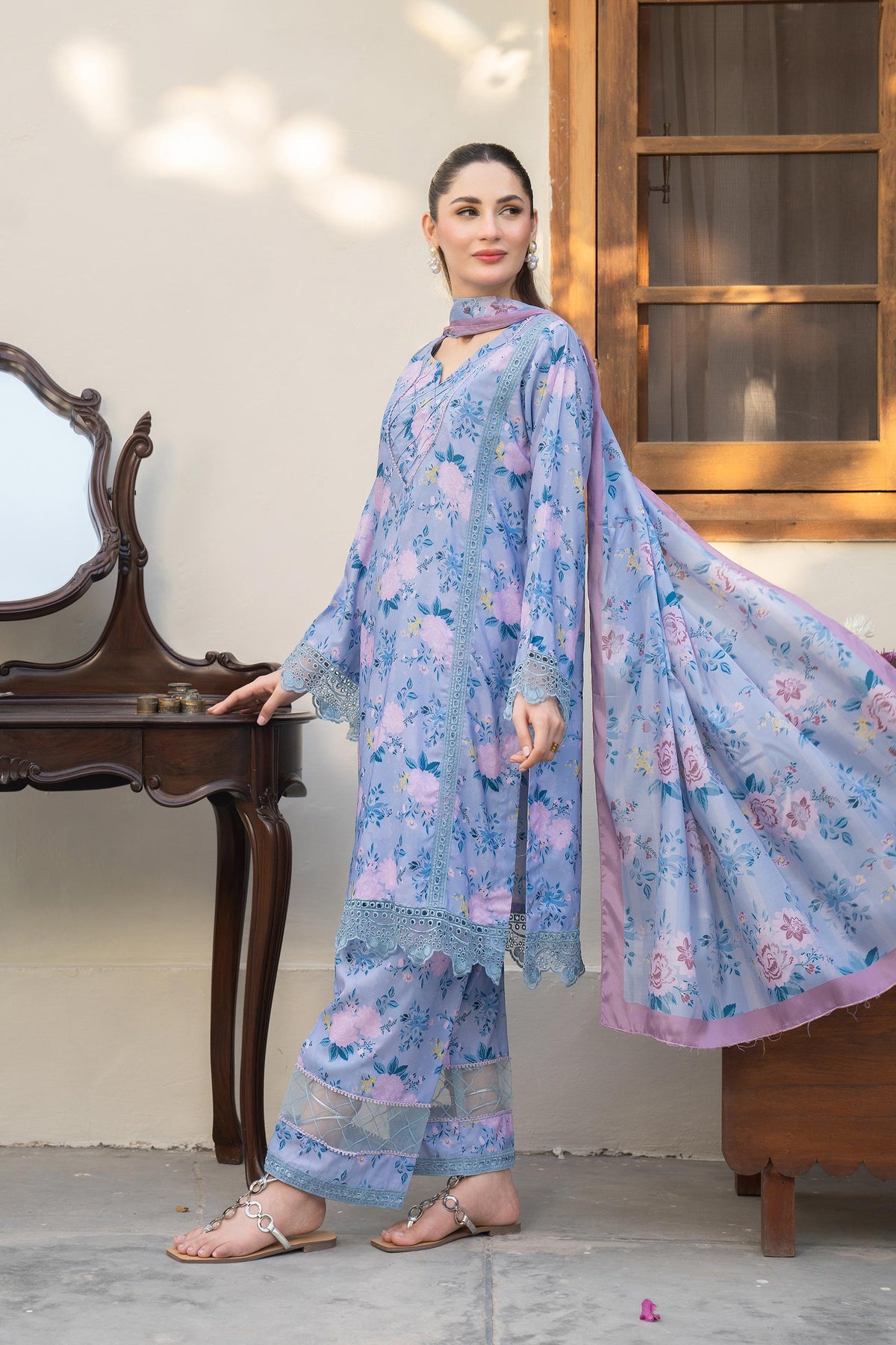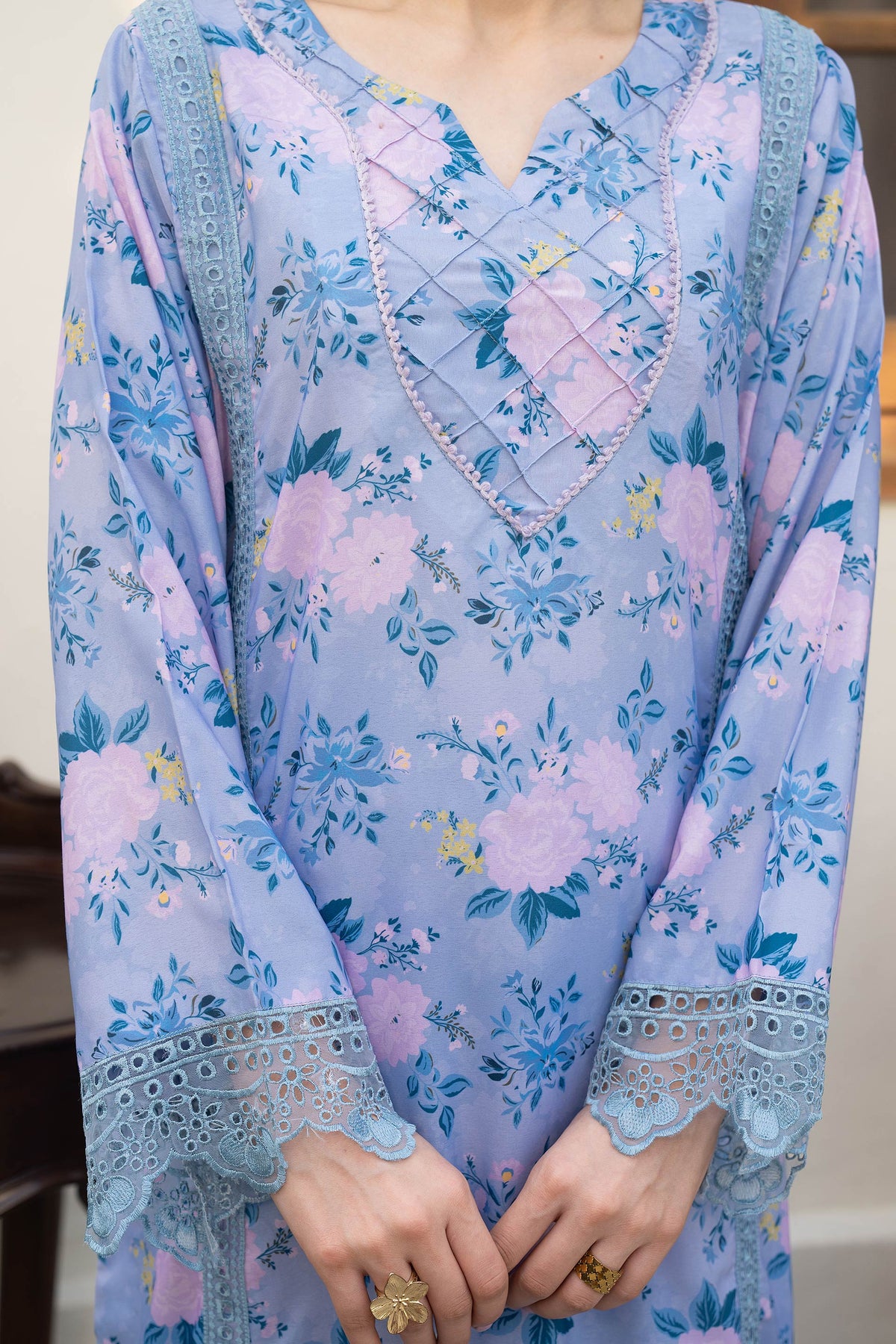 A calming blue canvas touched with soft floral blooms in lilac and rose. The delicate detailing and flowy silhouette create an elegant everyday look that feels light and graceful. Paired with a coordinated dupatta for a complete seasonal statement.