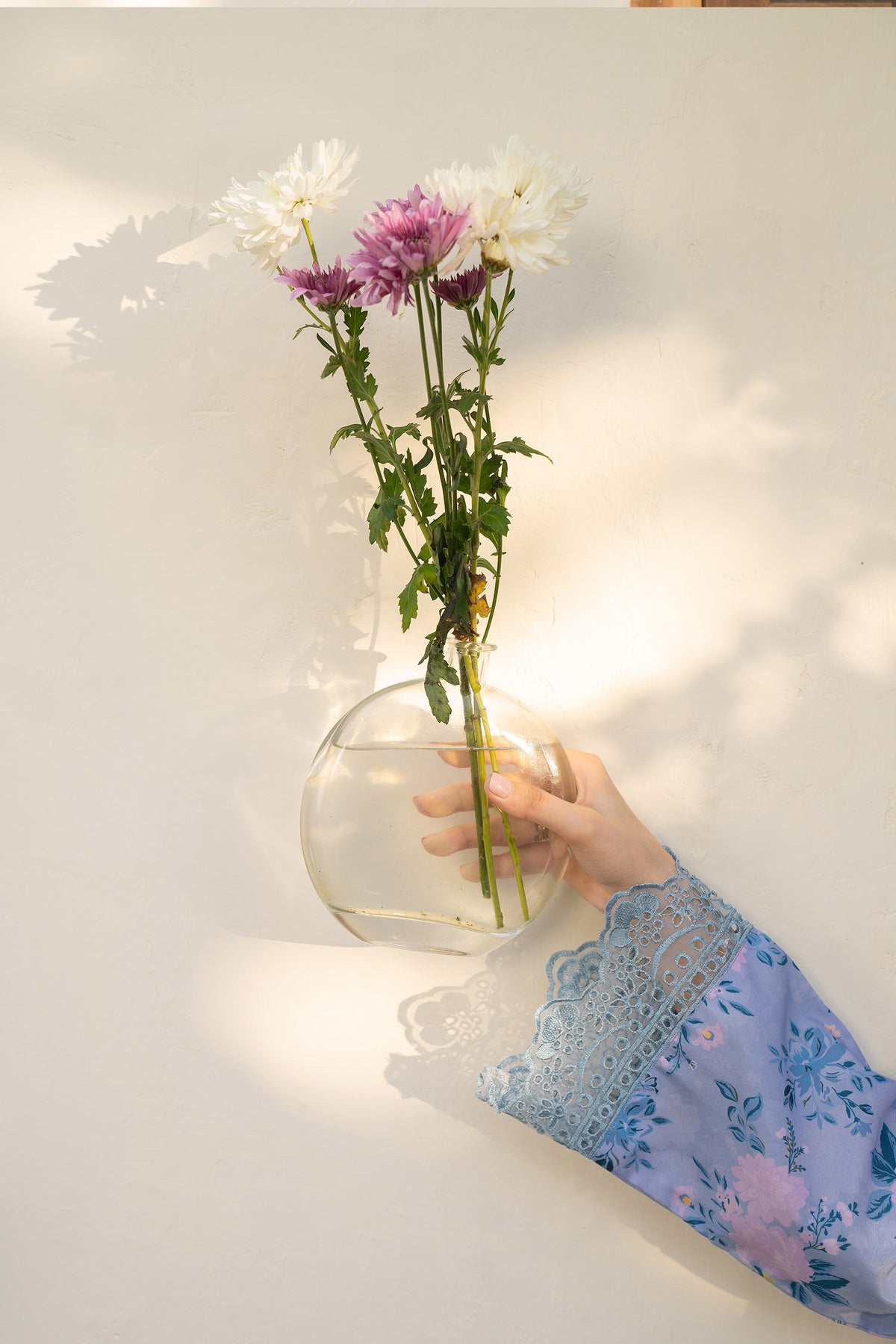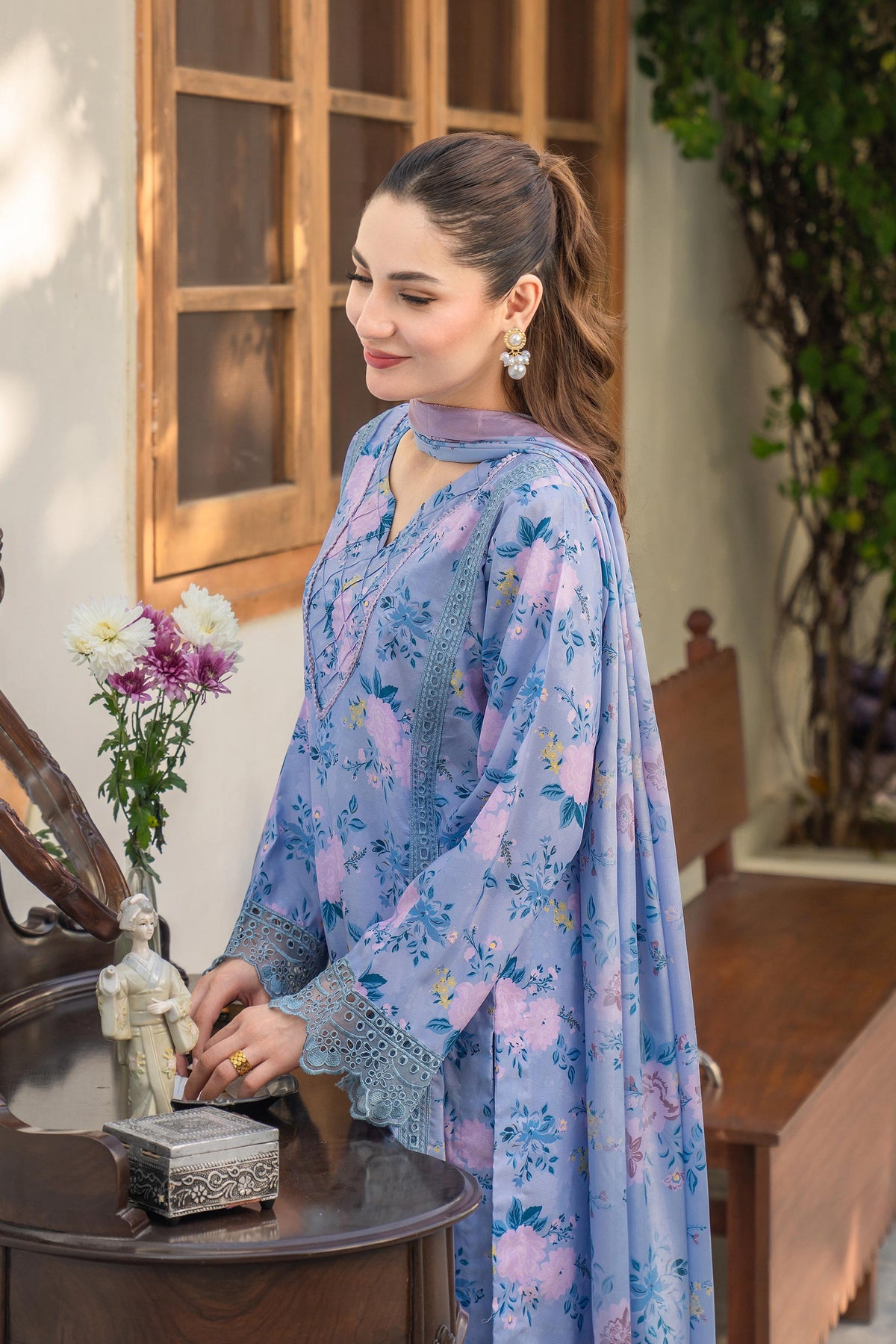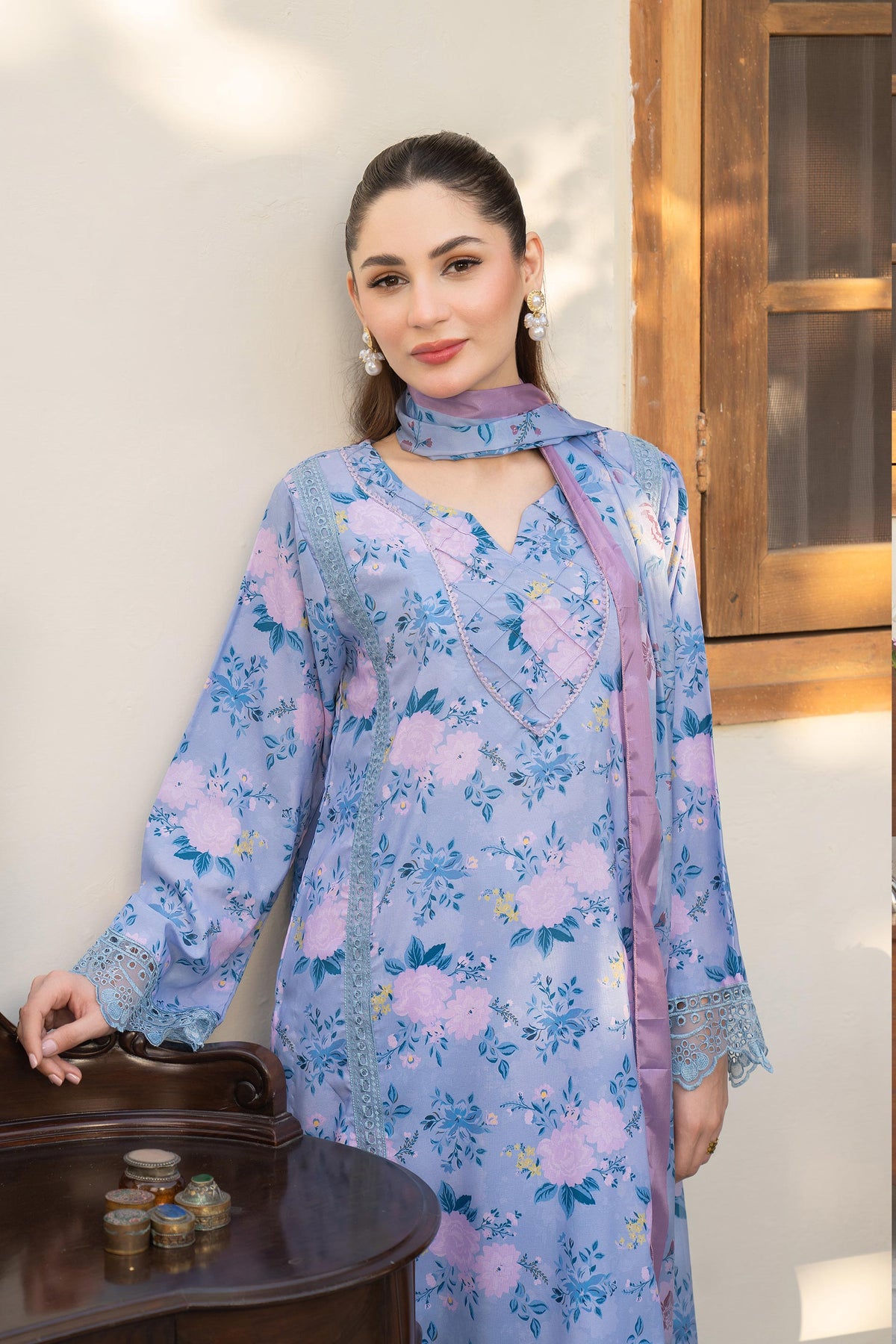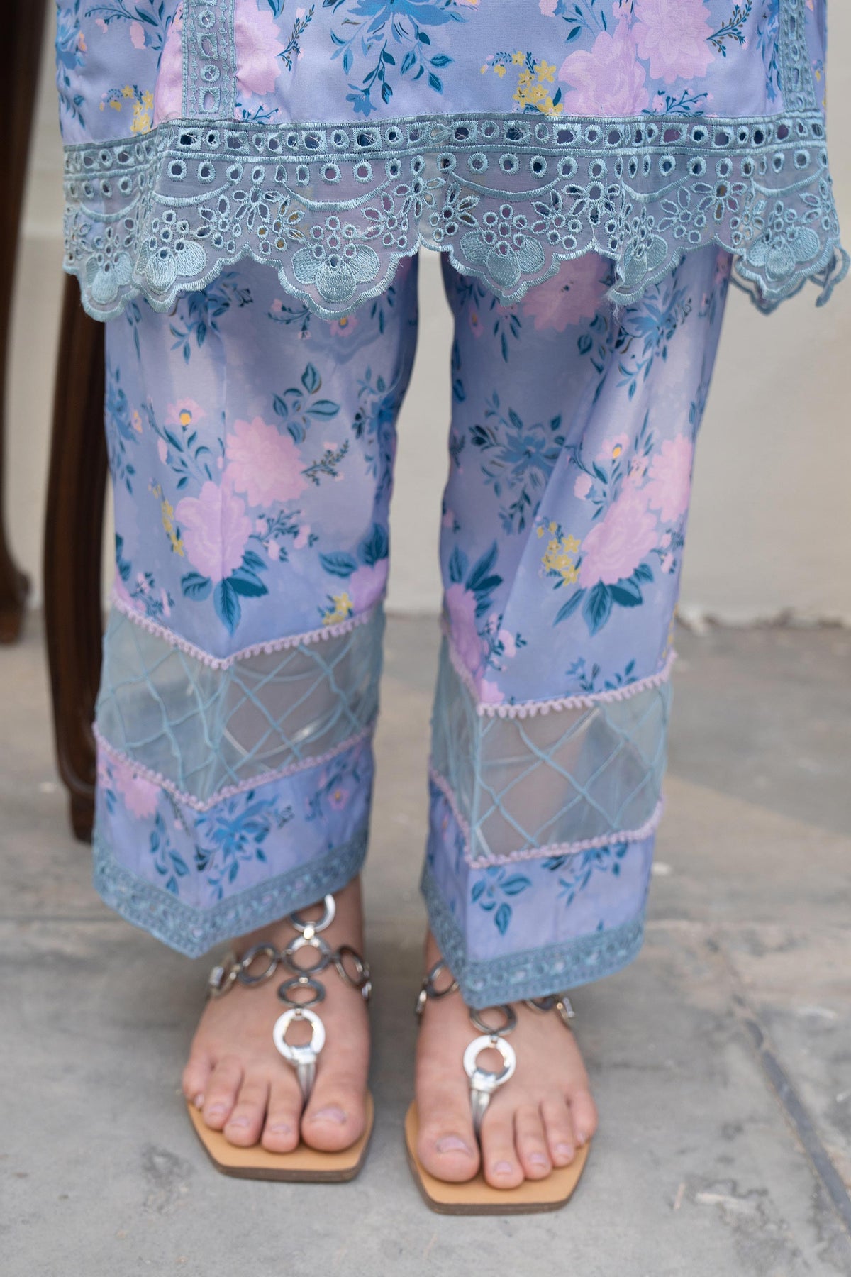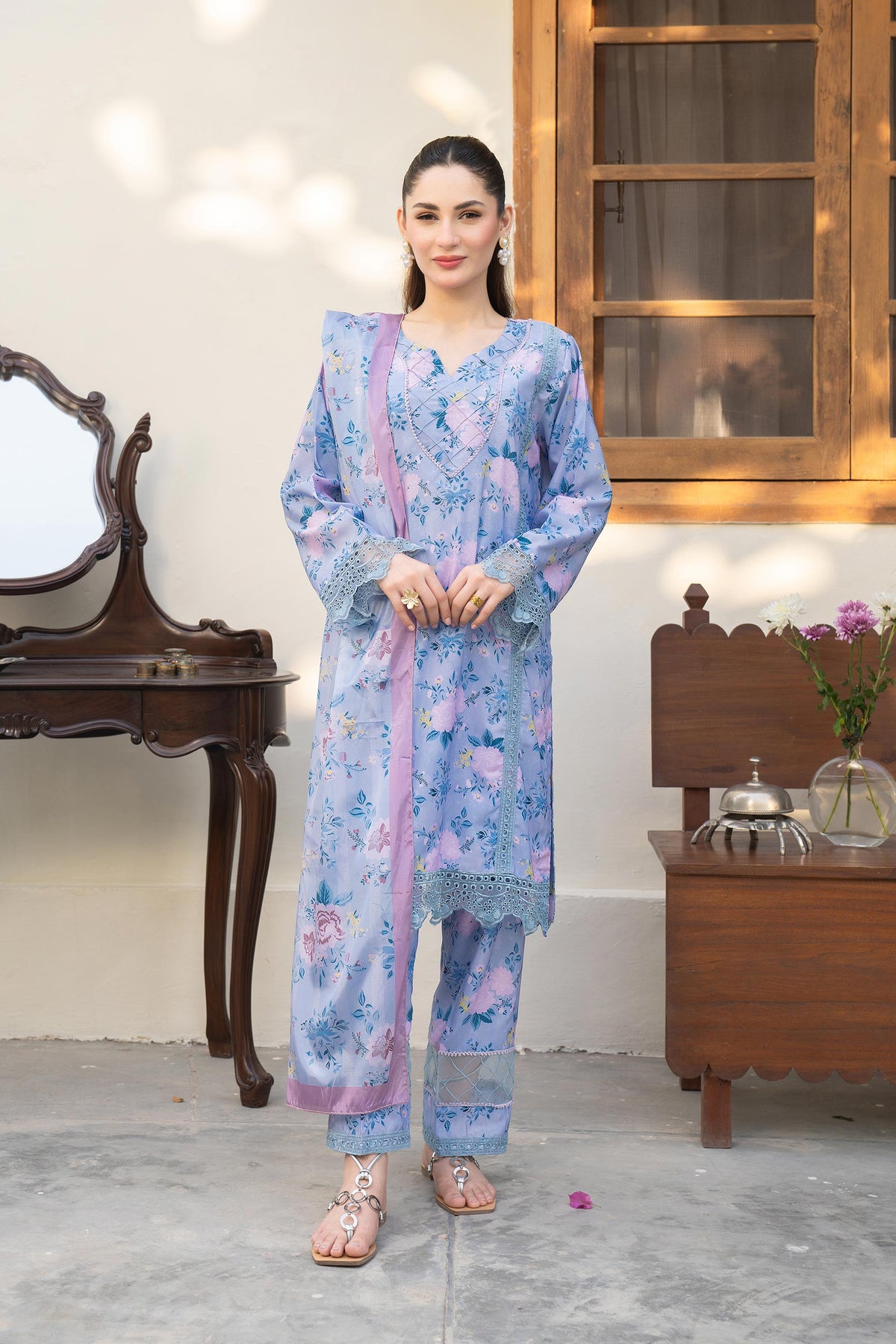 A calming blue canvas touched with soft floral blooms in lilac and rose. The delicate detailing and flowy silhouette create an elegant everyday look that feels light and graceful. Paired with a coordinated dupatta for a complete seasonal statement.