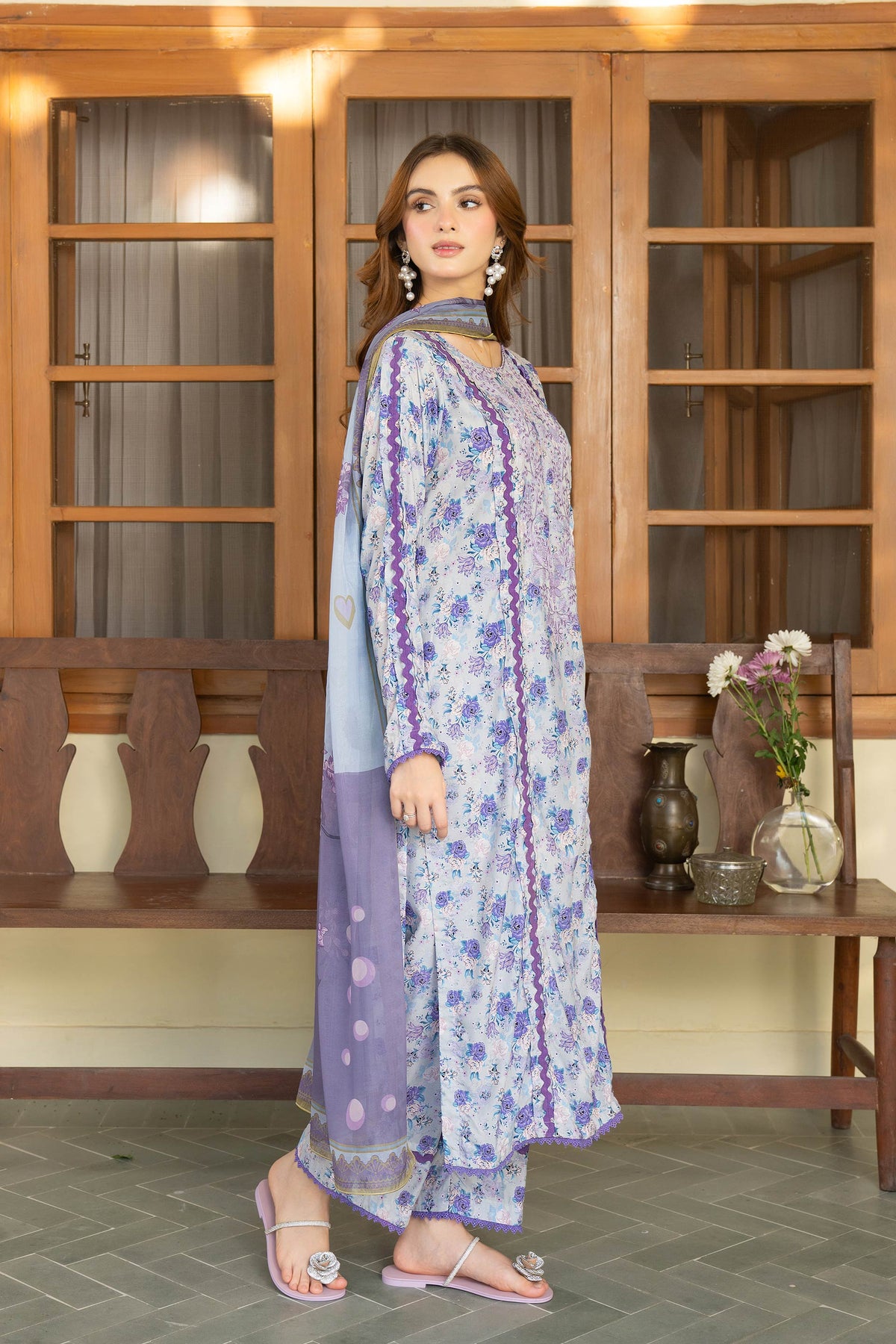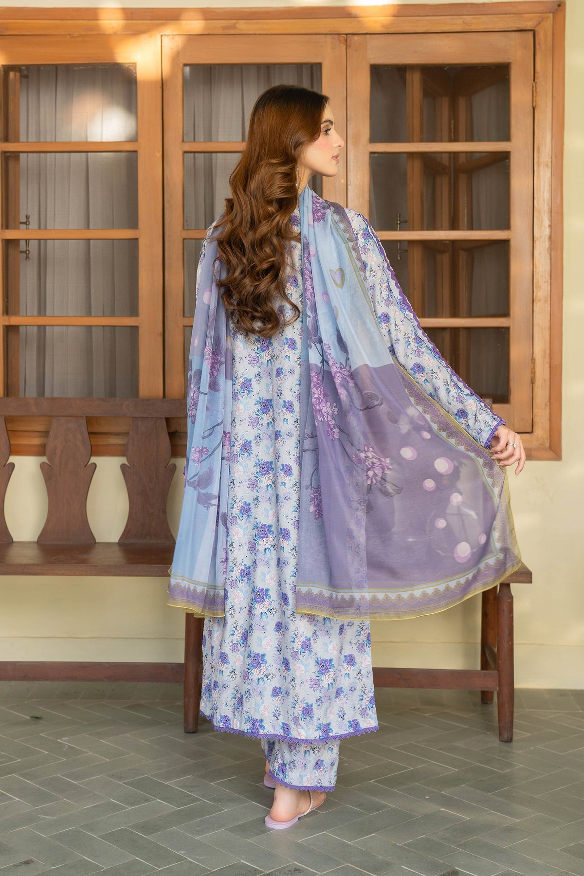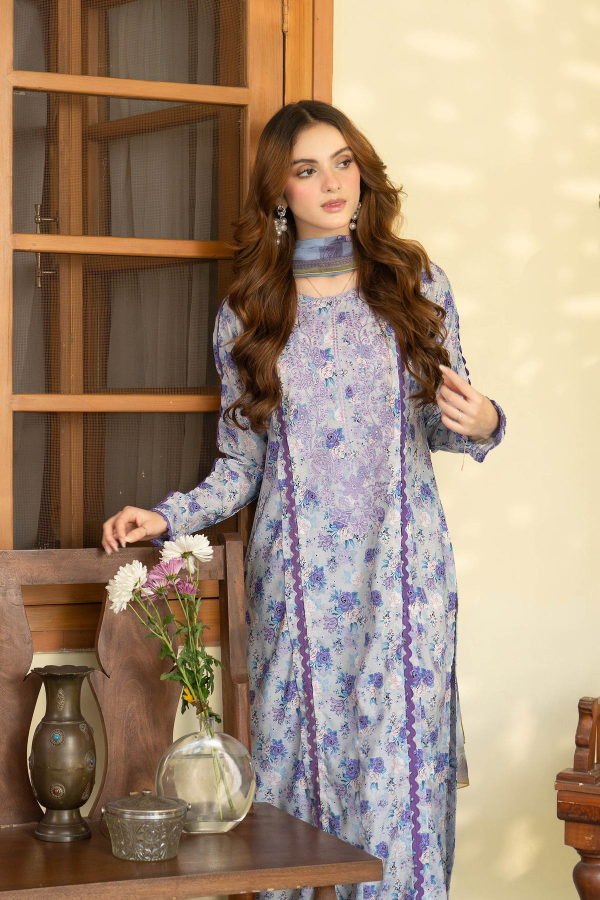 A soothing periwinkle canvas adorned with delicate floral prints, styled in a straight silhouette for an easy, graceful fall. Paired with a matching printed dupatta to complete the soft seasonal mood.