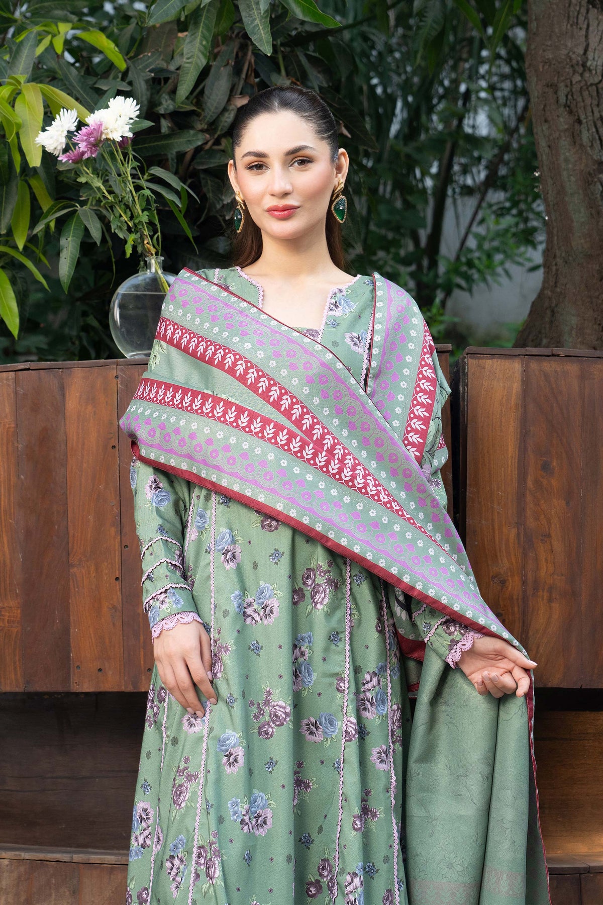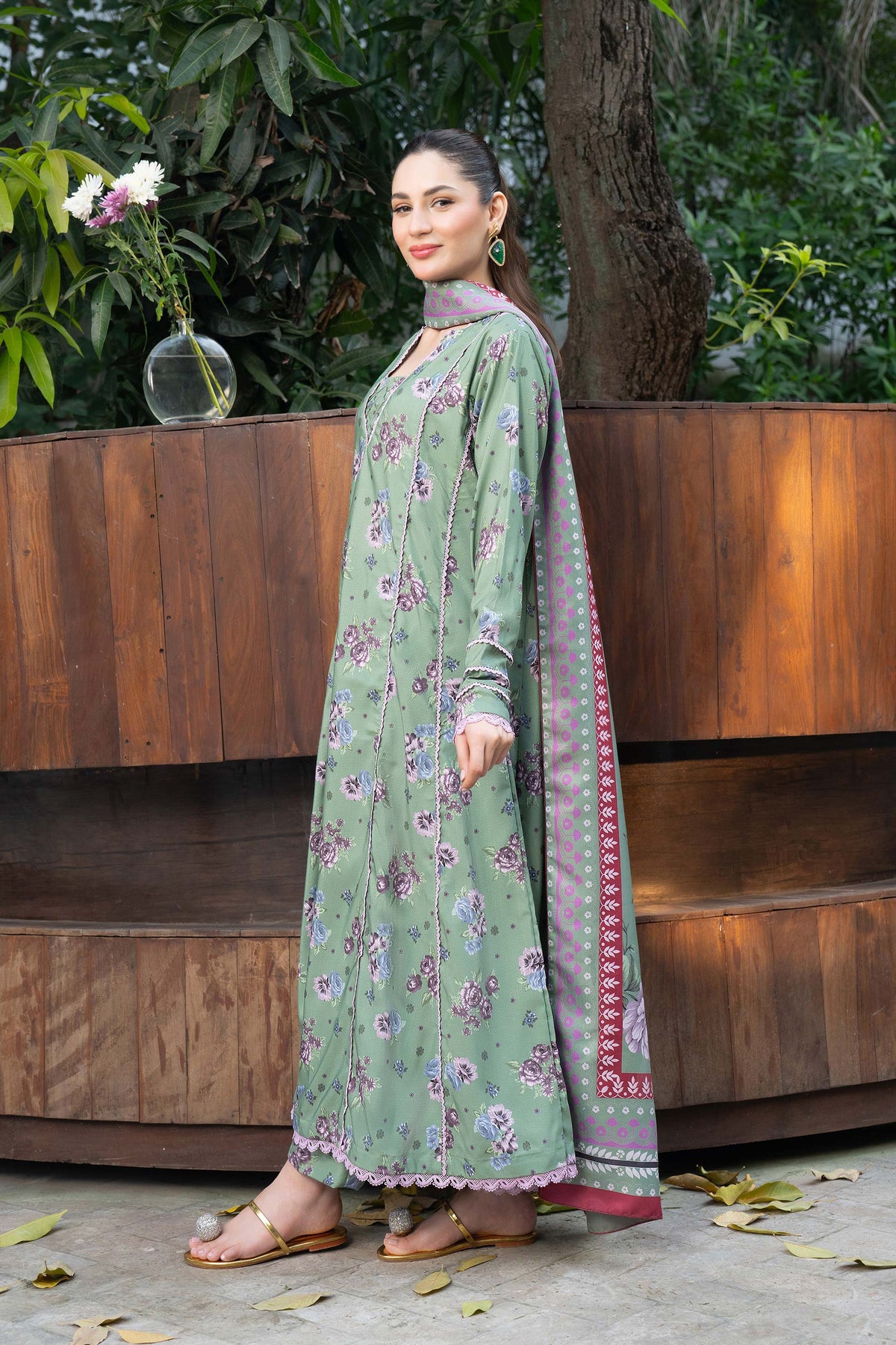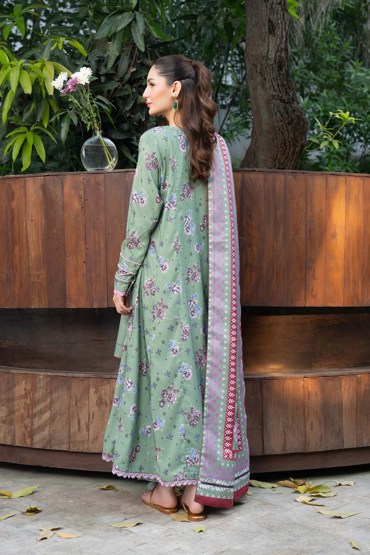 A refreshing pistachio canvas softly decorated with floral prints, paired with a contrast dupatta that adds gentle color balance.