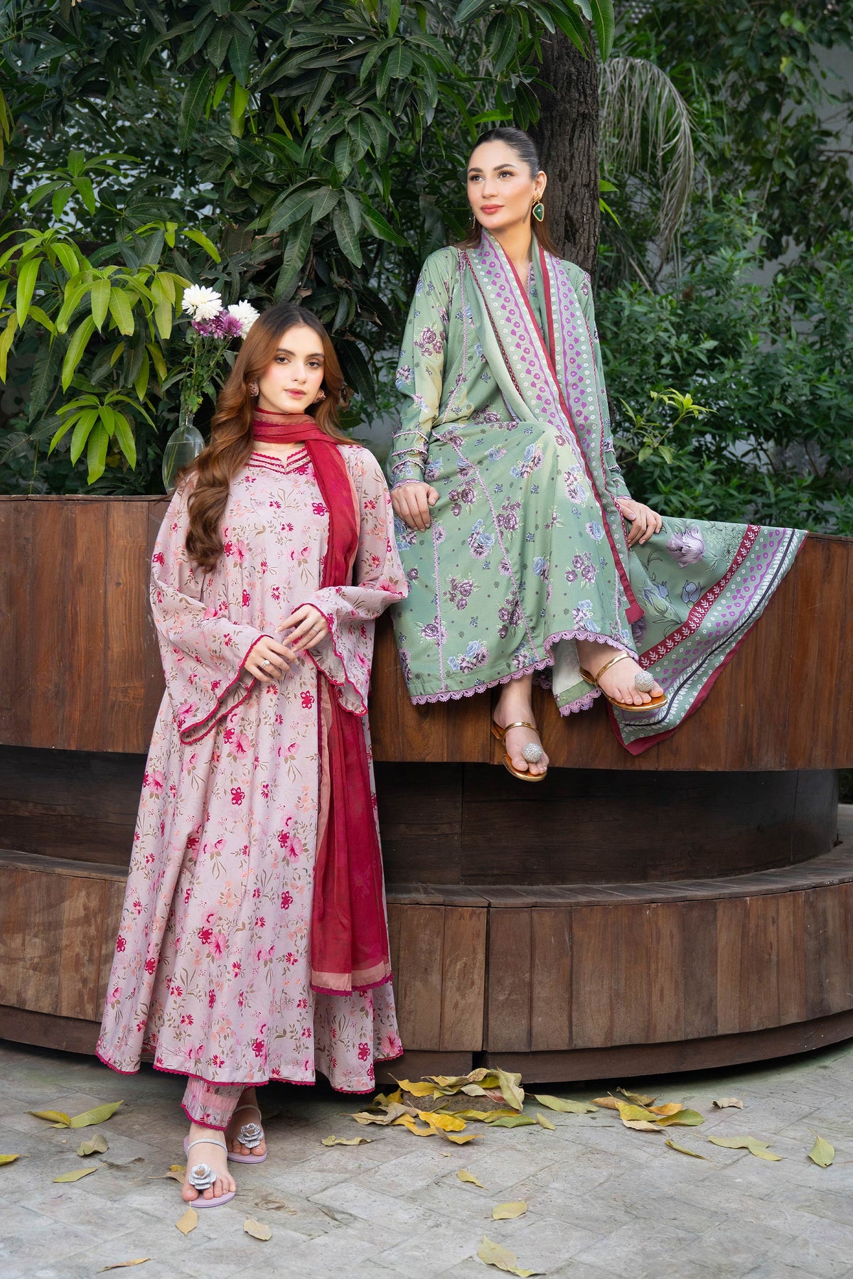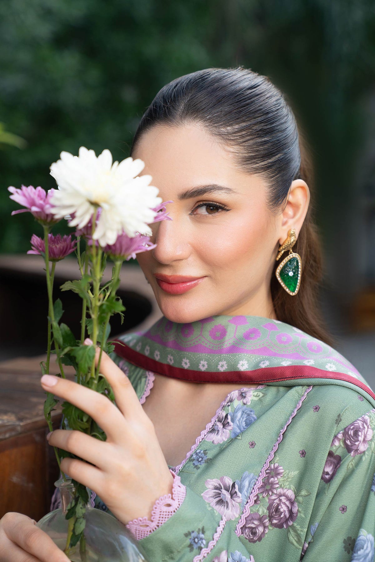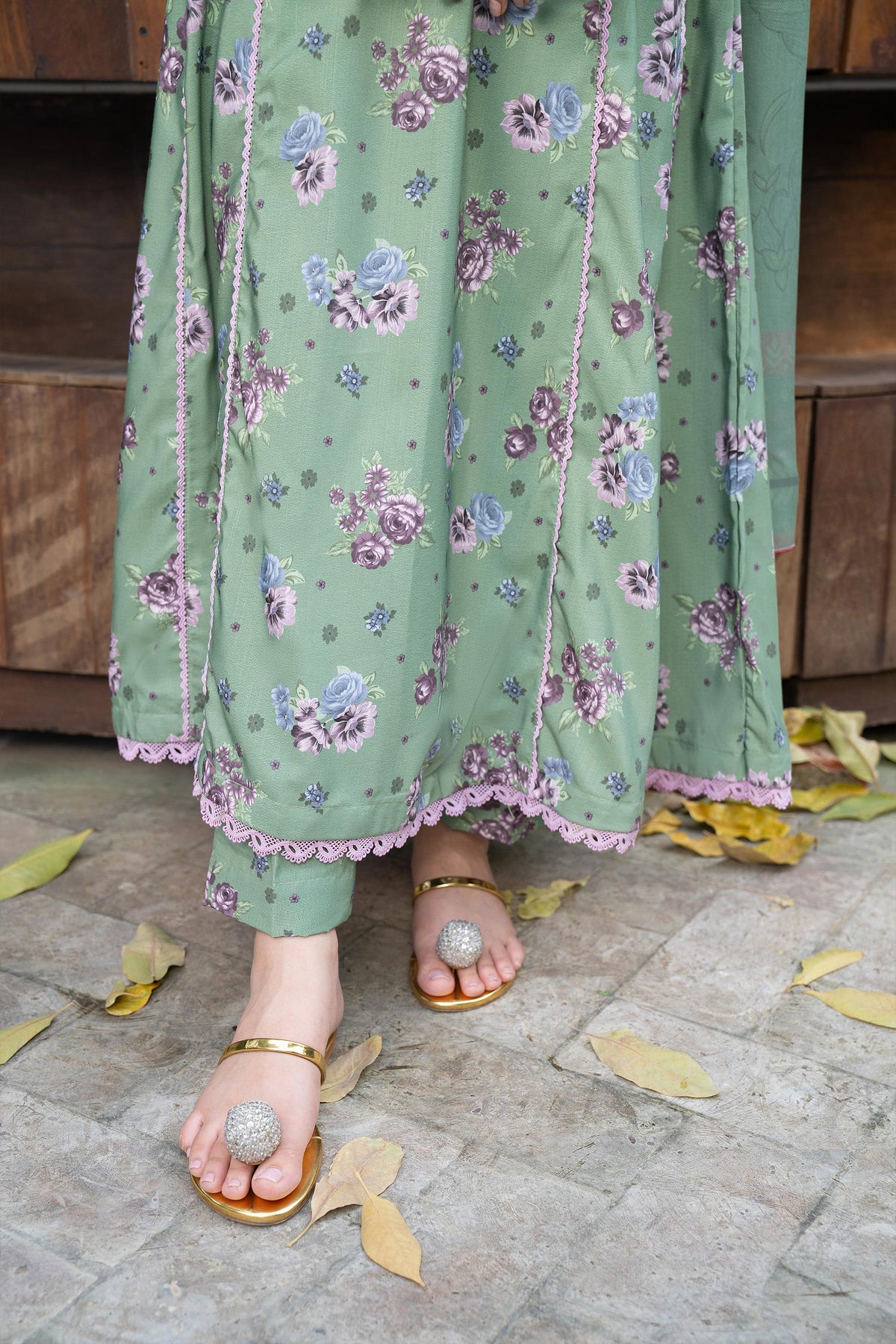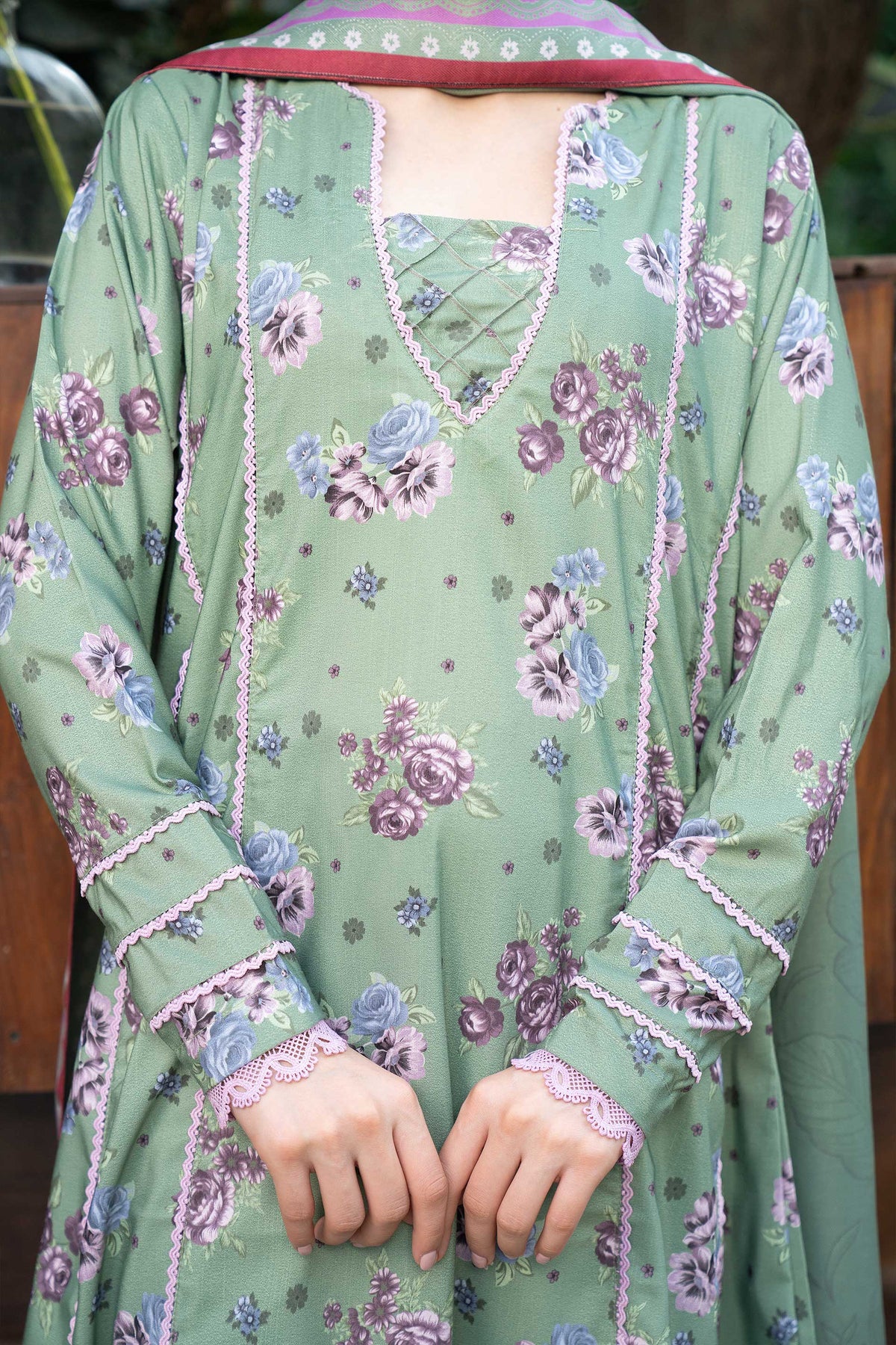 A refreshing pistachio canvas softly decorated with floral prints, paired with a contrast dupatta that adds gentle color balance.