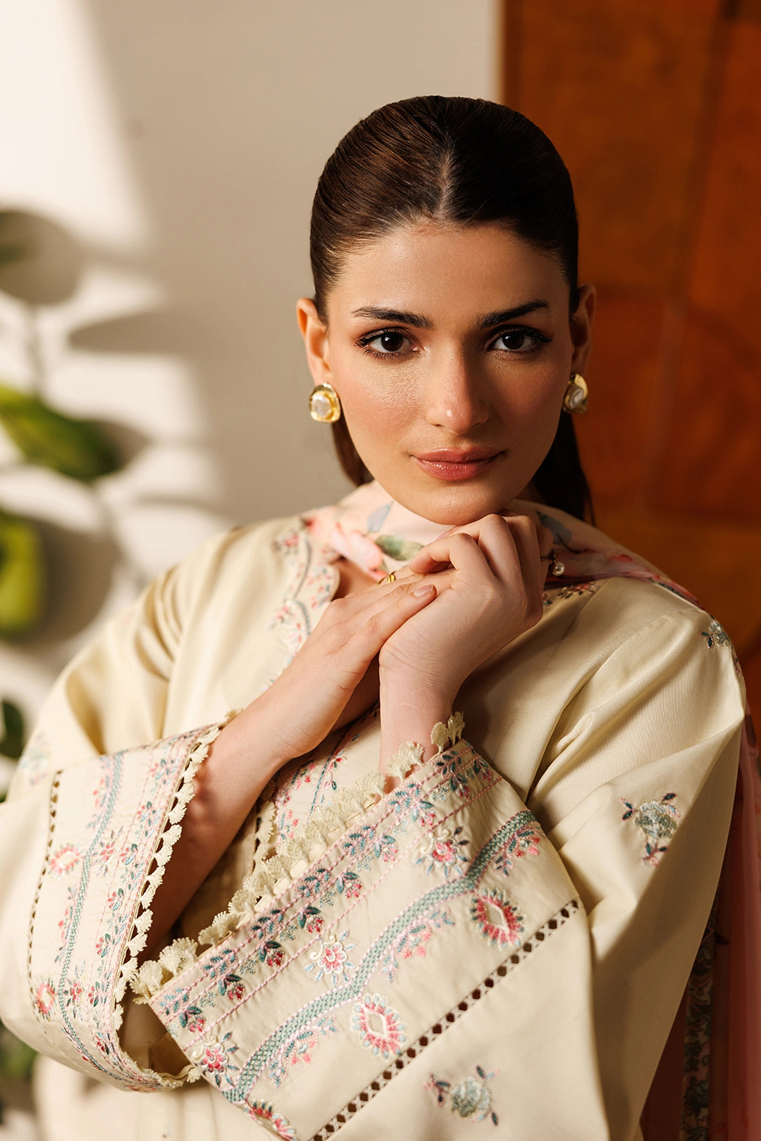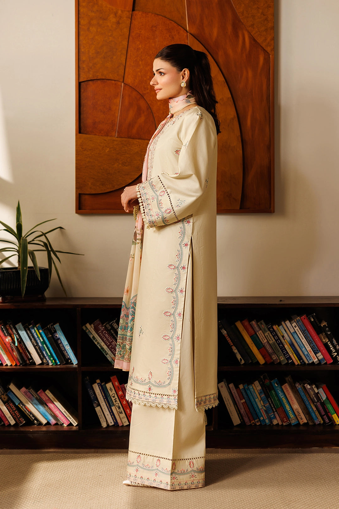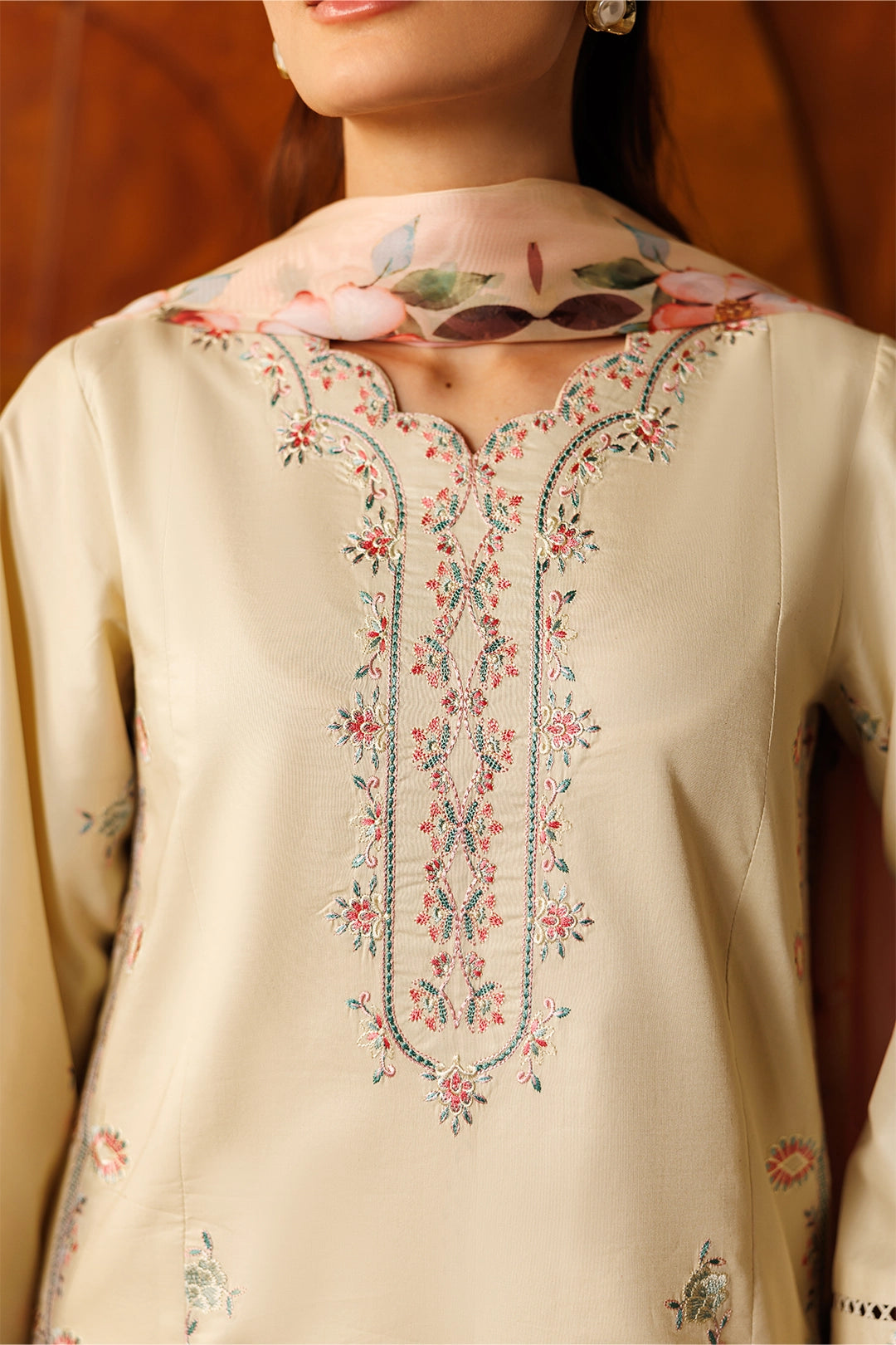 Color: CreamFabric: CottonWork: Fully Embroidered ShirtBottom Style: Embroidered FlapperDupatta: Silk Digital Printed