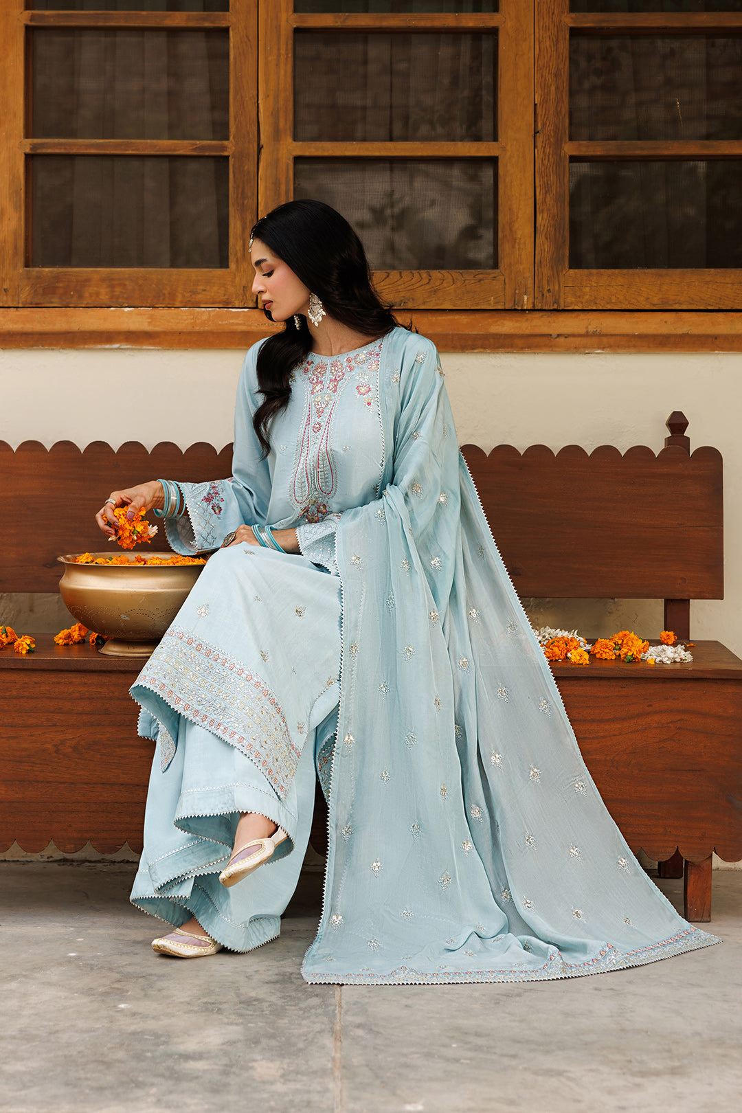 Color: Sky Blue Fabric: Elvish Rawsilk Work: Fully Embroidered 3Piece with tilla work Bottom Style: Loose Straight Trouser Duppatta: Embroidered Tilla and Sequence work on Silk