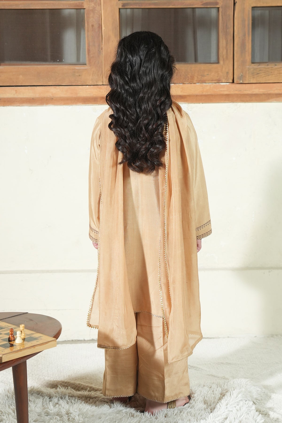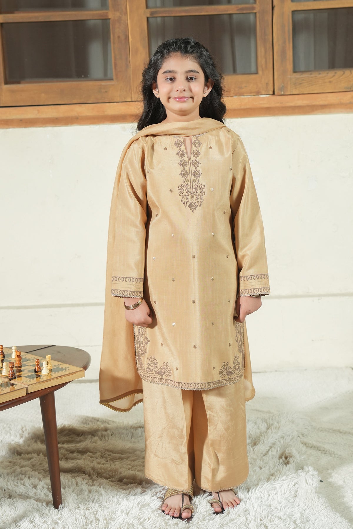 Color: GoldenFabric: Sheesha SilkWork: Sequence Embroidered ShirtBottom Style: Silk TrouserDuppatta: Dyed Silk